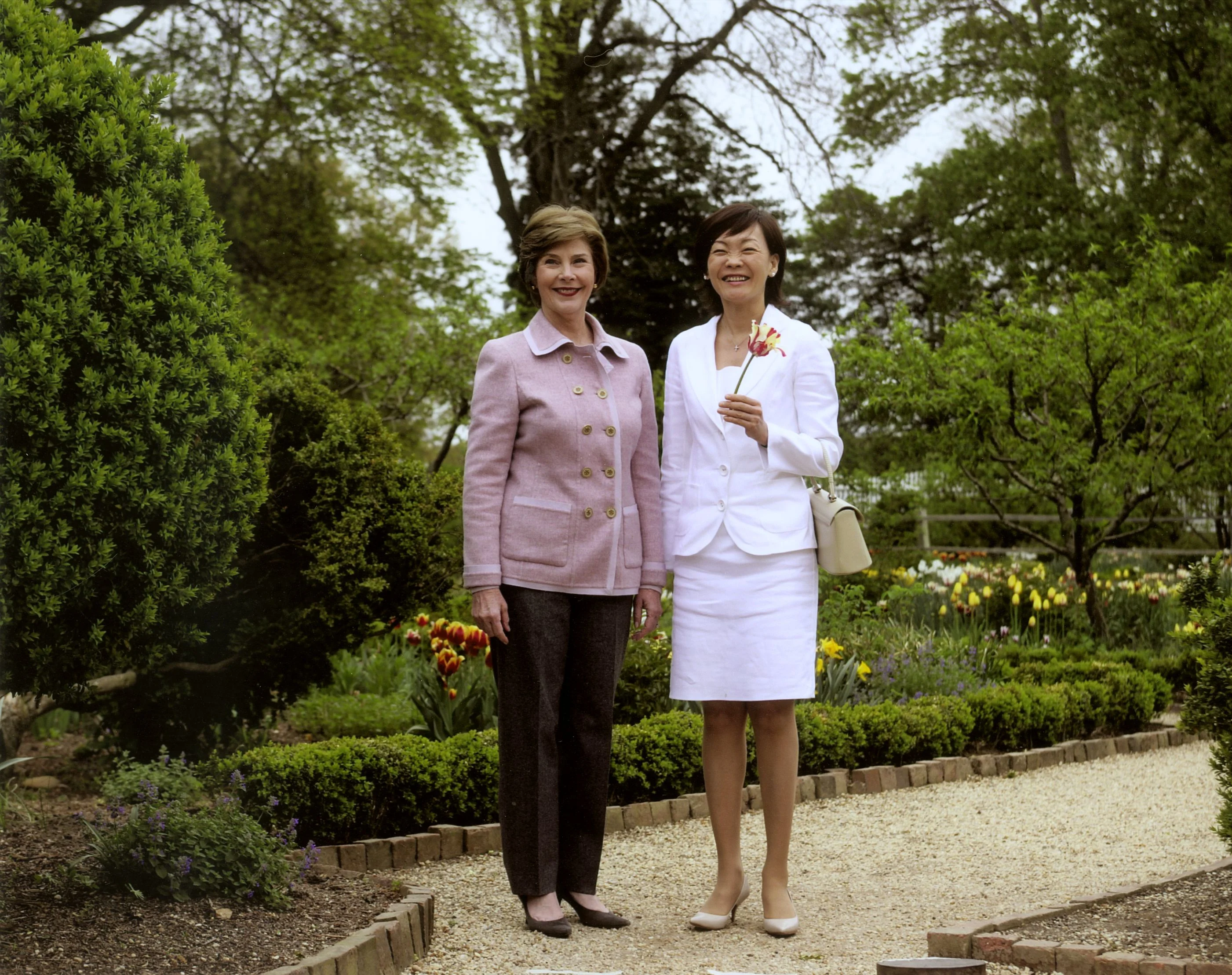 On April 26, 2007, while President George W. Bush was in Washington, D.C., meeting with Japanese Prime Minister Shinzo Abe, Japanese First Lady Akie Abe traveled to Mount Vernon with First Lady Laura Bush. While touring the Upper Garden, Mount Vernon's Director of Horticulture picked a French tulip for Mrs. Abe, as seen in the photograph above.