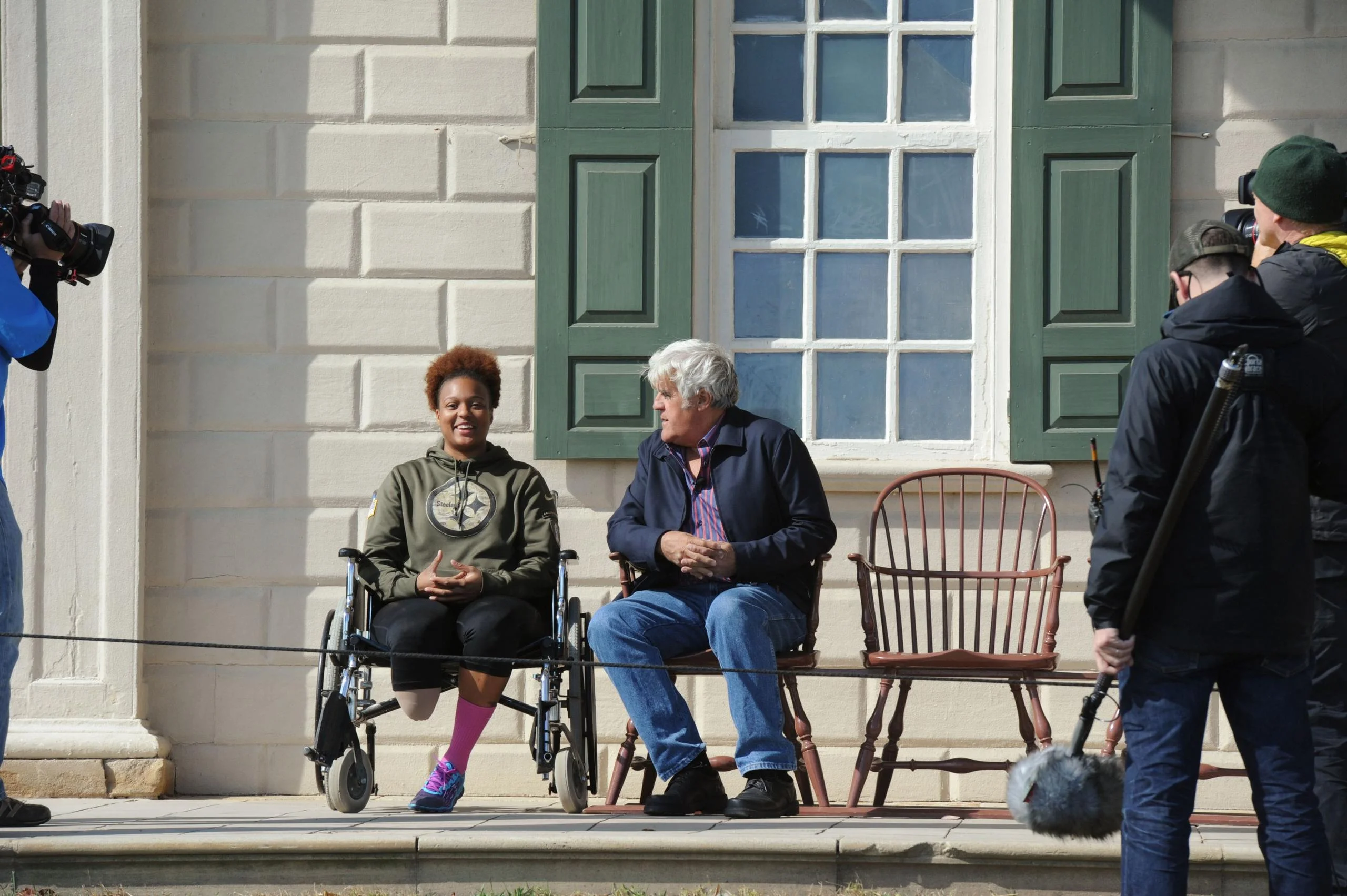 Morris arrived in a sporty white Fiat, driven by Leno, while producers from NBC’s Today Show chronicled her visit for a November 1 broadcast. Having lost her lower right leg in a 2013 incident in Afghanistan that claimed the lives of every other member of her unit, Morris received the Purple Heart in recognition of her sacrifice. While touring the estate with Leno, Morris paused for a visit at the Purple Heart Memorial, noting George Washington’s connection to the American military’s oldest honor.