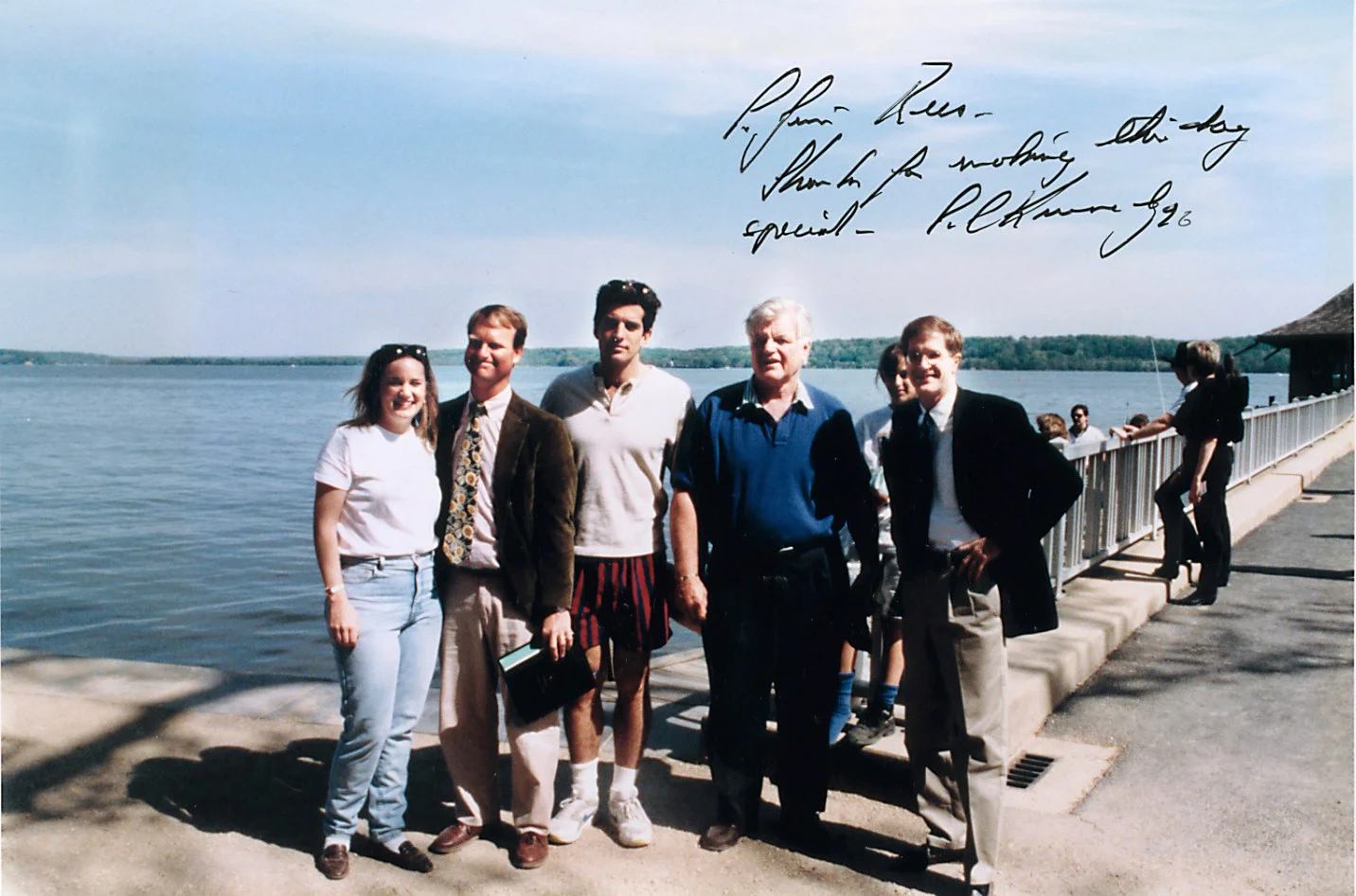 Mount Vernon's Director of Restoration Dennis Pogue greets Senator Edward M. Kennedy at the wharf as Resident Director James Rees (far right) prepares to offer a tour of the estate. The Senator — who doubled as skipper —arrived with John F. Kennedy, Jr. (far left) and several friends aboard the speedboat, 'Grand Fromage.' JFK, Jr., co-founder and editor-in-chief of the new magazine named after Washington, George, was making his first visit to Mount Vernon. The group joined 6,838 other visitors on a beautiful Sunday afternoon.