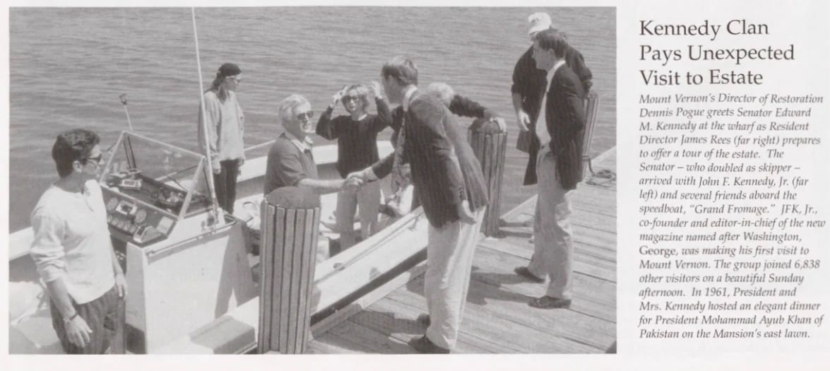 On Sunday, April 28, just two days after the conclusion of the world-famous auction of Kennedy Family memorabilia, the much-wealthier John F. Kennedy, Jr., made his first visit to Mount Vernon. A party of about seven guests arrived on a small, somewhat down-on-its-luck speedboat named 'Grand Fromage' aka 'Big Cheese,' skippered by Senator Ted Kennedy. Dennis Pogue [Director of Restoration] and Sally McDonough [Manager of Media Relations] joined me in leading the Kennedy clan on a tour of the estate.