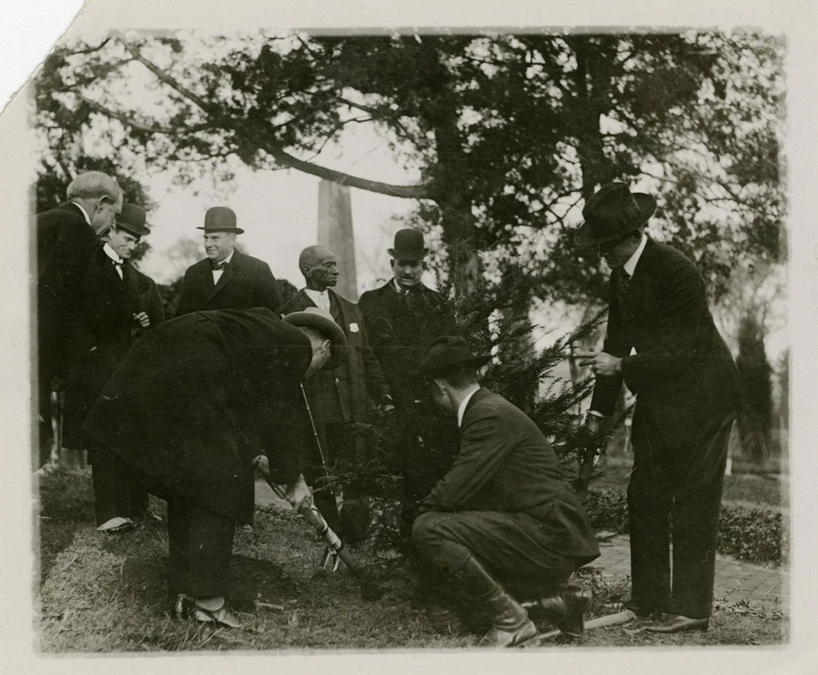 In 1919, the Prince of Wales came informally by automobile, escorted by Vice President Marshall, Secretary of State Lansing, Assistant Secretary of State Phillips and other prominent officials. After depositing his evergreen tree upon Washington’s sarcophagus, he planted an English yew in front of the tomb a short distance from where his illustrious grandfather in 1860 made an unsuccessful attempt to start another tree. The Prince said to the young man whom I instructed to hand him the shovel, ‘What branch of the service were you in during the war?’