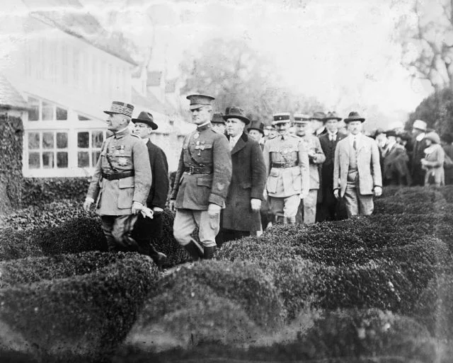 Marshal Ferdinand Foch visited Mount Vernon during his tour of the United States in the autumn of 1921 as a special guest of the American Legion. He was accompanied by several other officers of the French and American military. After placing a wreath on Washington’s tomb, he and his party were given a brief tour of the Mansion. Several days earlier, the Superintendent of Mount Vernon, Harrison H. Dodge was asked to send a tree sapling from the grounds of Mount Vernon to New York for Marshal Foch to plant during a ceremony. Mr. Dodge provided a “small White Oak” for the purpose.