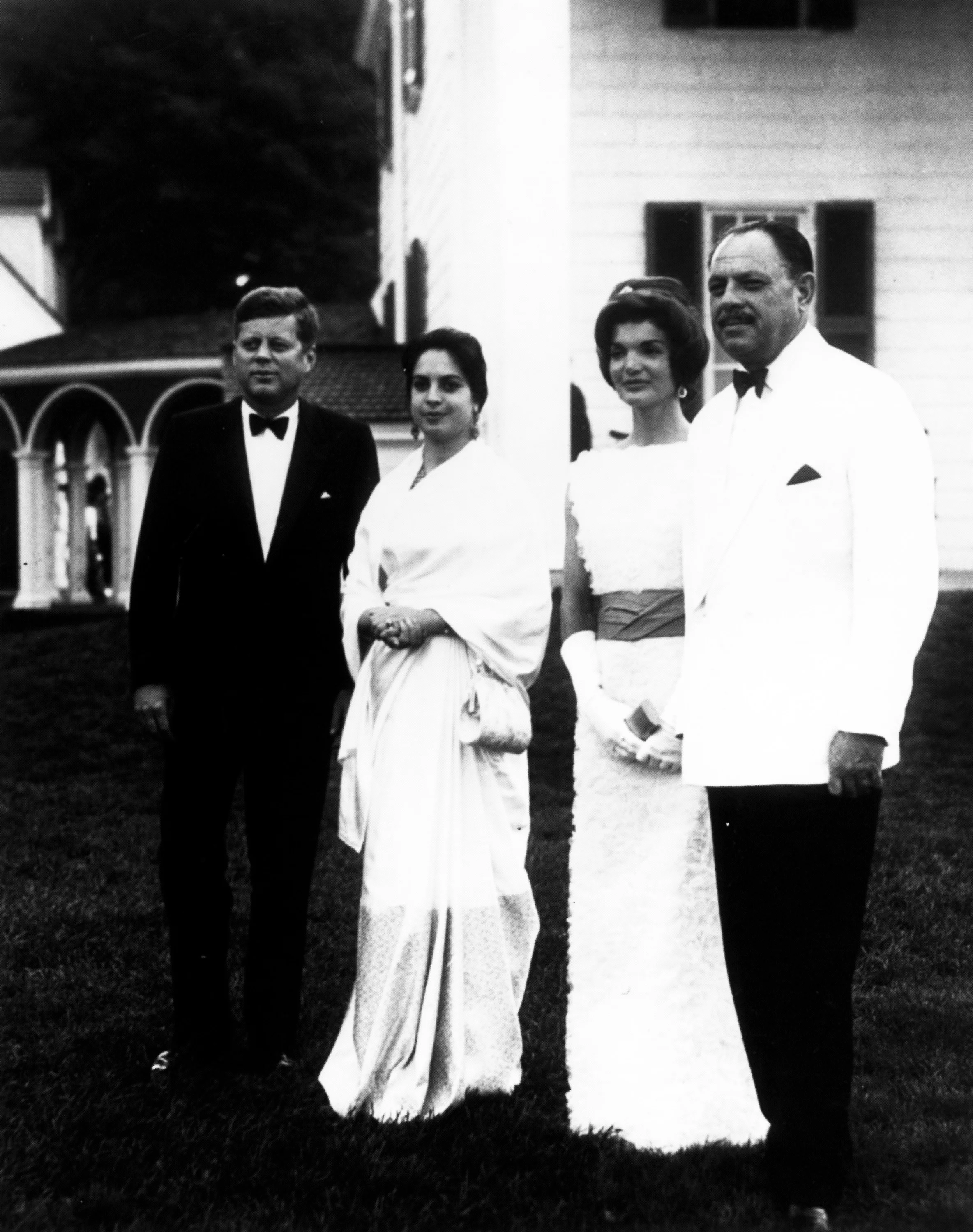 Jackie Kennedy wore a sleeveless white organza and lace evening gown, with a chartreuse silk sash. President Ayub Khan's daughter Naseem Akhtar Aurangzeb wore a white silk sari.