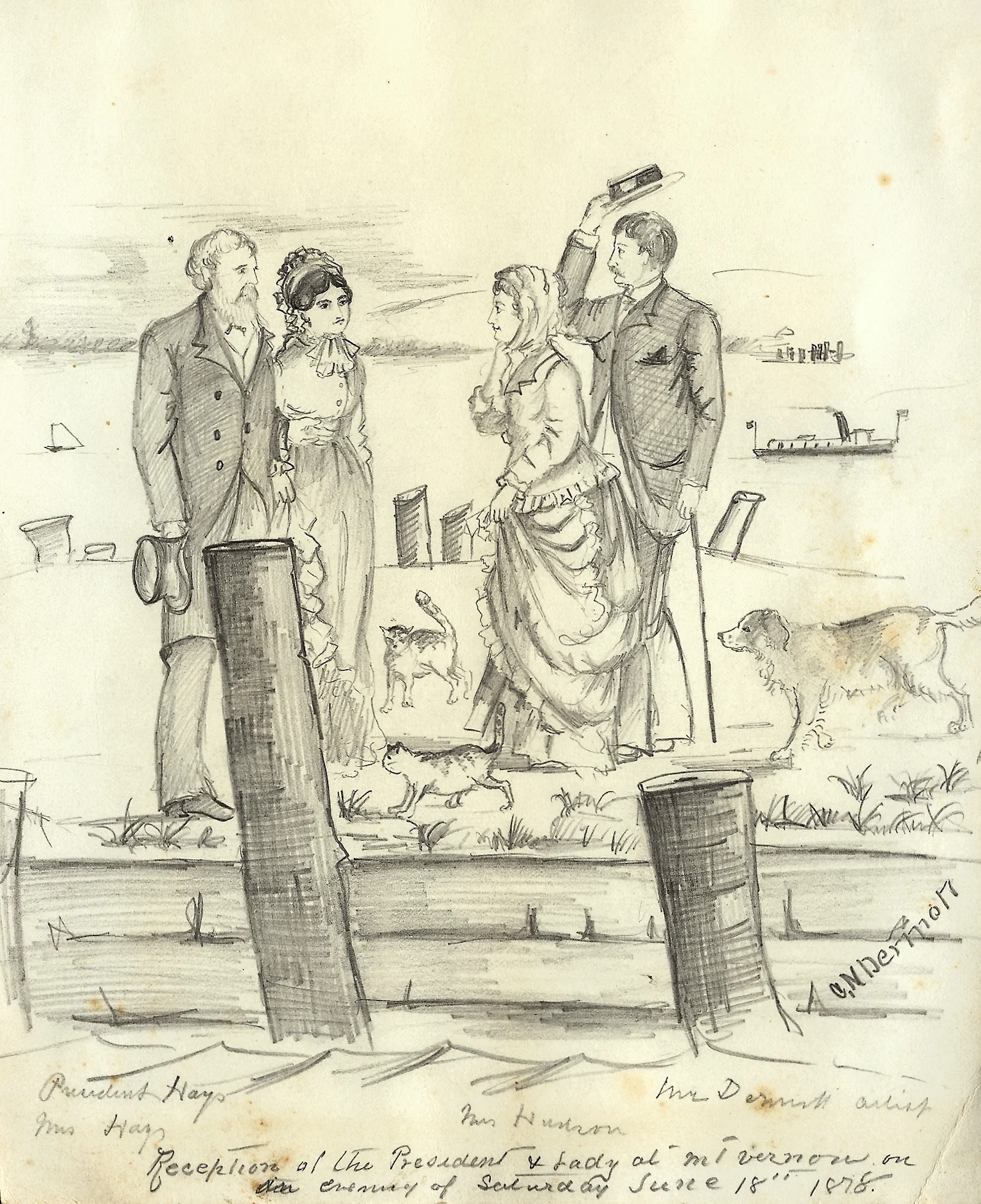 Mount Vernon's archives contain a pencil sketch on paper by Mr. (Charlie) McDermott portraying the visit of President Rutherford B. Hayes and First Lady Mrs. Hayes at the wharf landing at Mount Vernon. Also portrayed are the artist, Mr. McDermott, and Susan E. J. Hudson, Vice Regent for Connecticut.