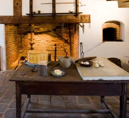 From the colonnade a door opened directly into the kitchen, the largest of three ground floor rooms, where the principal fireplace was located. Here the cooks busied themselves roasting, stewing, boiling, frying, and broiling the provisions. Multiple fires of different woods, depending on the type heat desired, could be accommodated at the same time in a large fireplace.