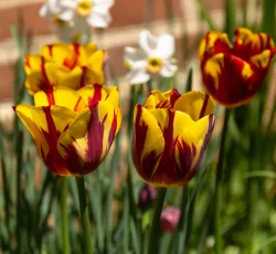 Helmar is a yellow and red tulip. Its red flames mimic the pattern of some of the broken tulips of the tulip mania.