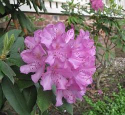 The rhododendron is an evergreen plant with large, lush pinkish purple blossoms in the spring.