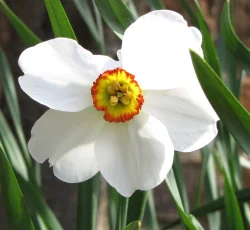 The Pheasant's Eye daffodil is a clear white daffodil featuring a yellow cup with a red ring. It is one of the later blooming daffodils and it does best towards the middle of the border.