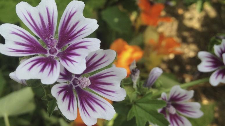 High Mallow is an upright, bushy plant with magenta flowers and darker purple stripes. It reseeds readily and naturalizes quickly in the garden.