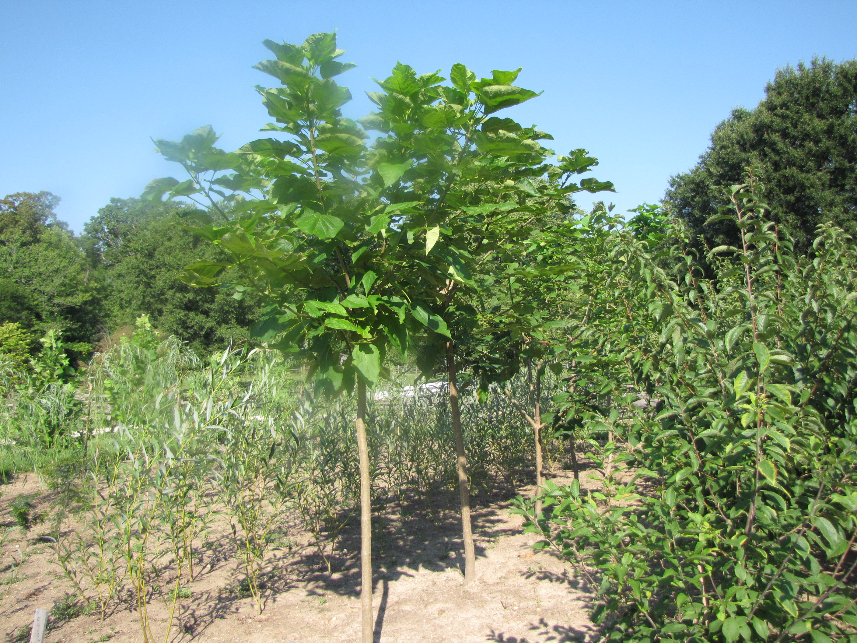 This native plant is a medium deciduous tree with large white flowers in the spring and striking cigar-like seedpods in the fall. It features large heart-shaped leaves.
