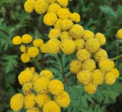 Tansy is a tough plant that can grow in almost any sunny spot. While its ferny foliage and clusters of cheerful yellow button flowers are attractive, it can be invasive due to its underground runners and propensity to re-seed.