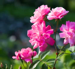 The highly fragrant damask rose offers a profusion of pink flowers in the spring. Flowers from this large and mostly upright shrub have been used for centuries in perfume making, as well as for rose oil, rose water, and for cooking.