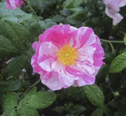 Rosa Mundi is a compact rose which features a profusion of bright striped flowers in the spring. The flowers are fragrant, and this old hardy rose shrugs off most pest problems, making them an easy favorite in the garden.