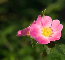 Eglantine roses are large and sprawling, with single pale pink flowers in late spring and early summer. They are strongly apple-scented and their hips are popular for use in tea. This rose may be restrained by growing on posts or trellises to control its long, thorny canes.