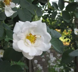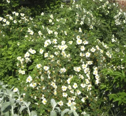 Scotch rose is aggressively thorny but makes up for it with a profusion of white blooms. We recommend a thorn-proof hat when working in the vicinity of this rose! It offers a second show in the fall with showy maroon hips.