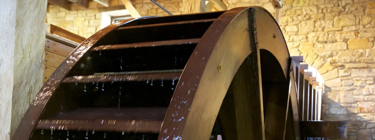 The water entered the mill through a wooden box known as a flume, or penstock. The miller could open a water gate from inside the mill to release water into the wheel to operate the machinery. The speed of the water wheel varied depending on how much the miller needed to grind and how fast he wished to work. The mill could produce about 3,000lbs of cornmeal a day and another 5,000lbs of wheat flour a day.