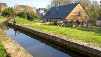The power needed to operate the mill came from the large waterwheel and the waterwheel needed a sufficient supply of running water to make its revolutions. To supply water to the wheel at a proper velocity, Washington's enslaved workers constructed a mill dam and pond at the upper end of Dogue Run Farm on the Dogue Run Creek. He then had them constructed an earthen canal, known as a millrace, to bring water down from the pond to the new merchant mill site. The trench that became the all-important millrace was almost two miles in length, seven or eight feet deep, and six feet wide.
