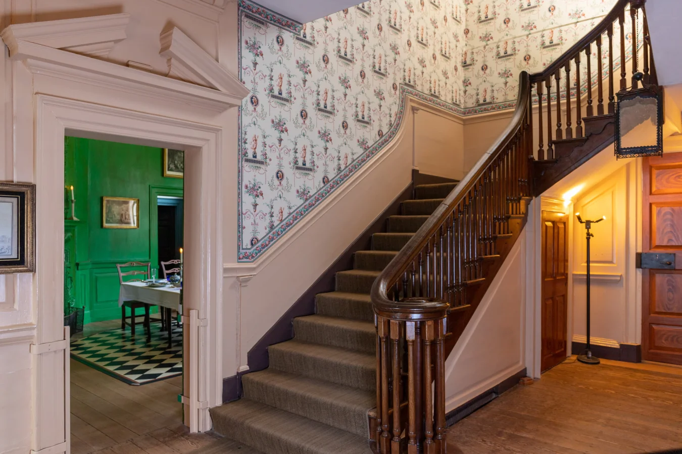 When George Washington enlarged the house, in 1758 and 1759, he added the native black walnut staircase to the central passage. Being prudent and practical, he moved the earlier staircase to provide access to the newly constructed third floor. The pine paneling on the first floor was also installed during the initial enlargement; later, in 1797, the paneling was grained, or painted, to imitate more expensive mahogany.