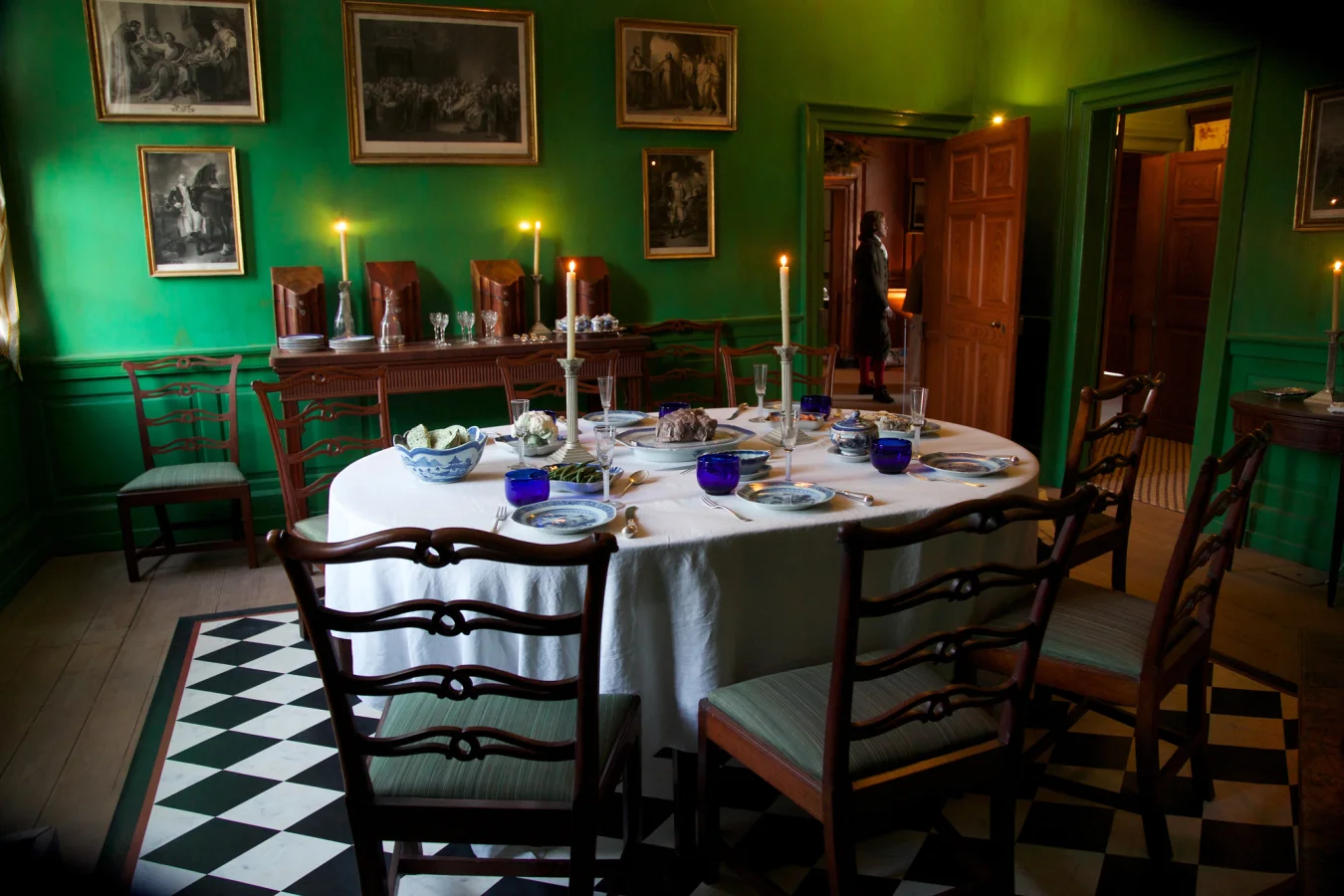 This is one of the most striking spaces in the Mansion. The dining room is part of the original house, built in 1734. Over the years, the room underwent a series of renovations. While George Washington was away commanding the Continental Army in 1775, the room was updated under the supervision of his cousin Lund Washington. In 1785, the striking verdigris-green paint was added. In an unrelated letter, Washington described the color green as “grateful to the eye" and less likely than other colors to fade. An overcoat of glaze further intensified the color of the dining room.