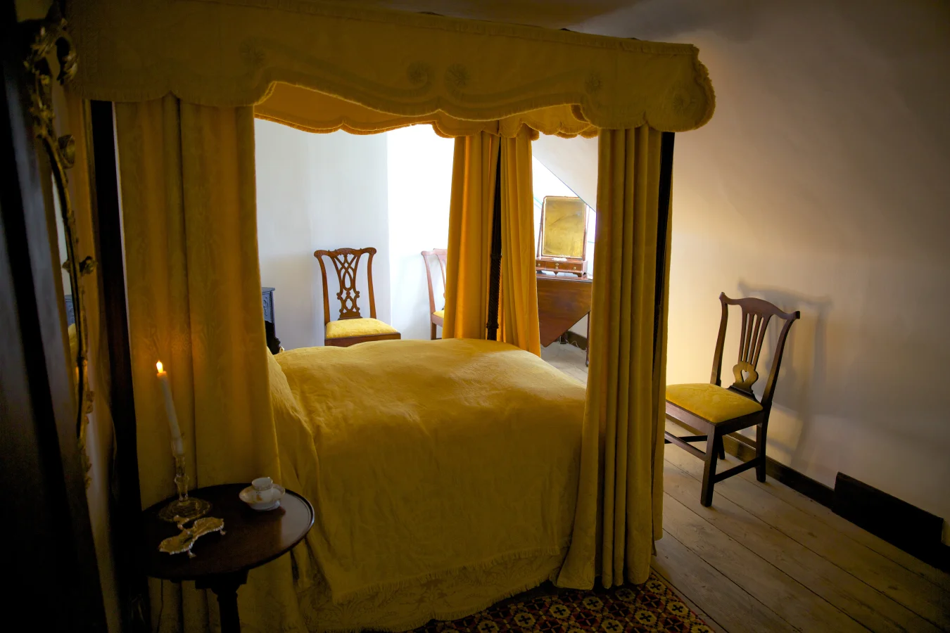 The four garret chambers were created by the remodeling work of the late 1750s. The rooms all changed slightly after the north and south extensions were completed in the 1770s. In their initial configuration, none of these rooms had a fireplace and were heated solely by radiant heat from the chimneys of fires burned in the rooms below.