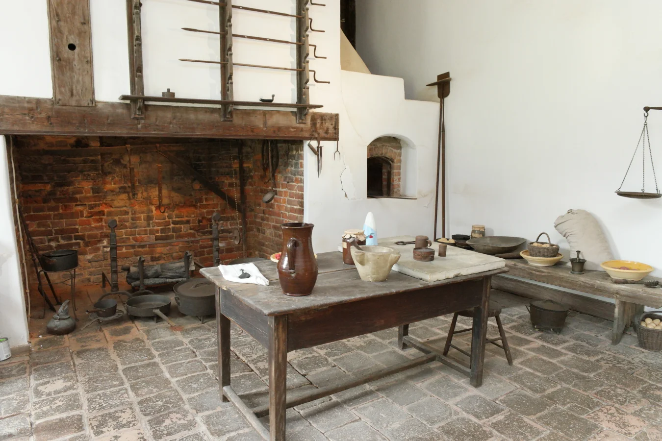 The updated kitchen included three workrooms on the first floor and a loft above. From the documentary record, we know the loft served as a residence at different times for Eleanor Forbes (a hired housekeeper) and John Fairfax (a hired overseer). The largest of the three workrooms included a fireplace and an attached oven. The other workrooms were a scullery where food was prepared and dishes were washed and a larder with a subterranean cooling floor to store food. According to the inventory of the kitchen completed after George Washington's death, the kitchen contained a wide variety of cooking equipment, including pots and pans, skillets, a griddle, a toaster, a boiler, spits, chafing dishes, tin and pewter "Ice Cream Pots," coffeepots, and strainers.