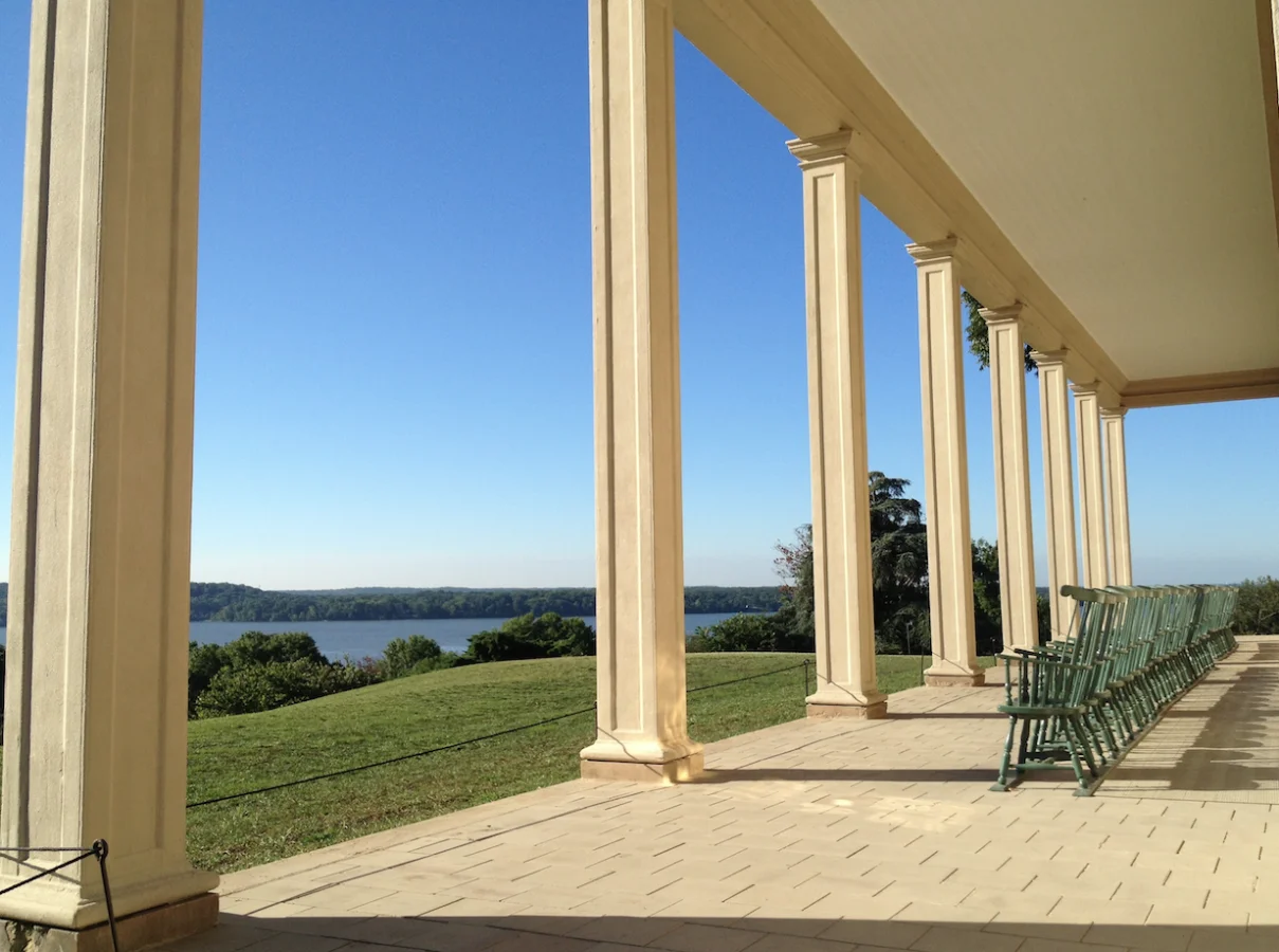 The two-story piazza is the Mansion's most distinctive architectural feature. Extending the full length of the back of the house, it also has a practical function—catching the river breezes on a hot and humid Virginia day. The Washingtons treated the piazza as an outdoor room, serving afternoon tea here to visitors and family members seated in simple Windsor chairs.