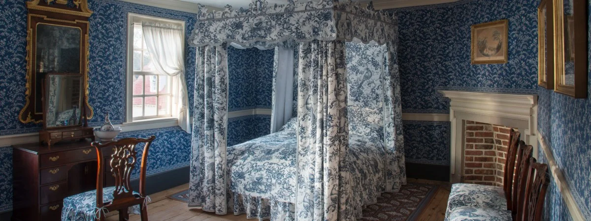 Located at the top of the stairs on the second floor, the Blue Room overlooked the front entrance and the view to the west. By the late 1790s, it served as a bedchamber for visiting family and guests.