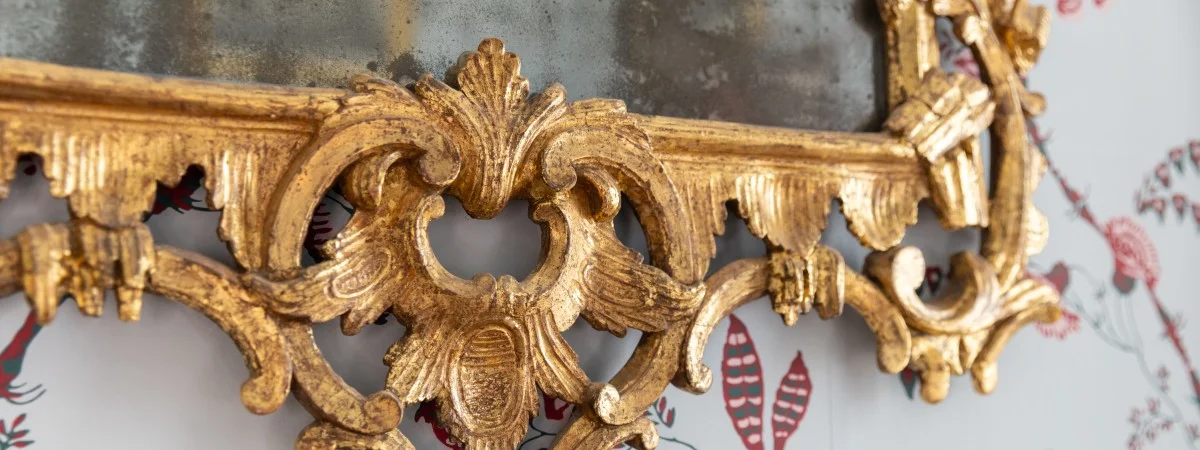 The original carved gilt rococo looking-glass brings reflected light and sparkle to the room and would have been particularly stunning during evening entertainments.