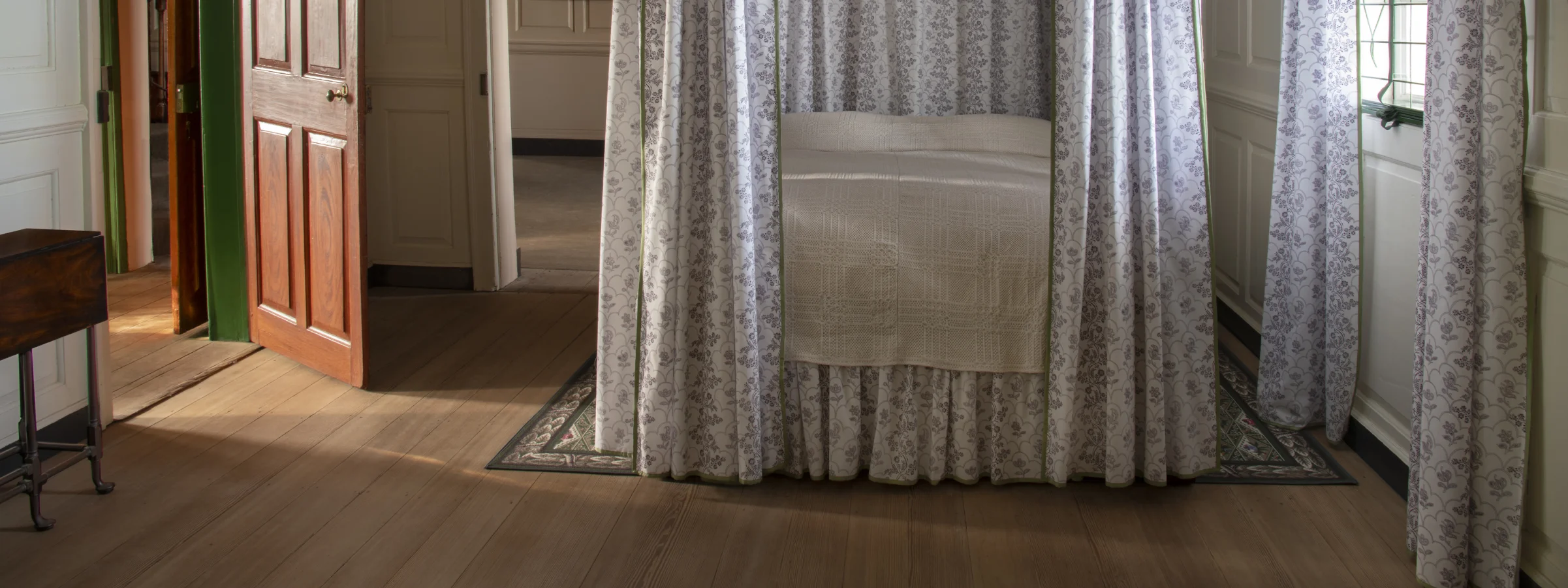 The bed, bedhangings, and window curtains represent purchases made by George Washington in Philadelphia in 1774. While in the city for the first Continental Congress, Washington purchased three sets of bedsteads and bedhangings for Mount Vernon. One of the sets of bedhangings was made from calico, or printed cotton fabric. Washington sourced these articles from cabinetmaker Francis Trumble and the upholstery shop of John and Betsy Ross, better known as a flagmaker.