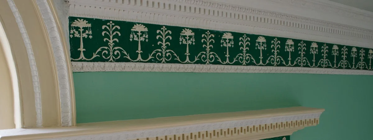 When Washington returned from the army on Christmas Eve 1783, he found the north wing an empty shell lacking interior woodwork. During this period, Washington corresponded extensively with a new acquaintance, Samuel Vaughan, about the latest developments in English domestic architecture. Vaughan had recently emigrated from London and was well versed in English fashions, including the delicate neoclassical plasterwork and vivid paint schemes favored by the stylish architect and designer Robert Adam. Work completed in the New Room between 1784 and 1787 included: putting up lath and plastering the walls; creating and installing plaster ornament; installing a doweled wood floor, cornices, and moldings; painting; and installing door hardware and firebacks.